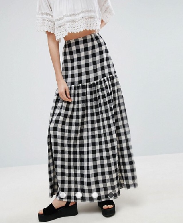 Asos High waisted maxi skirt £21 http://m.asos.com/asos/asos-high-waisted-maxi-skirt-in-gingham/prd/7812160?iid=7812160&clr=Blackwhite&SearchQuery=Maxi%20skirt&pgesize=50&pge=0&totalstyles=257&gridsize=2&gridrow=11&gridcolumn=2