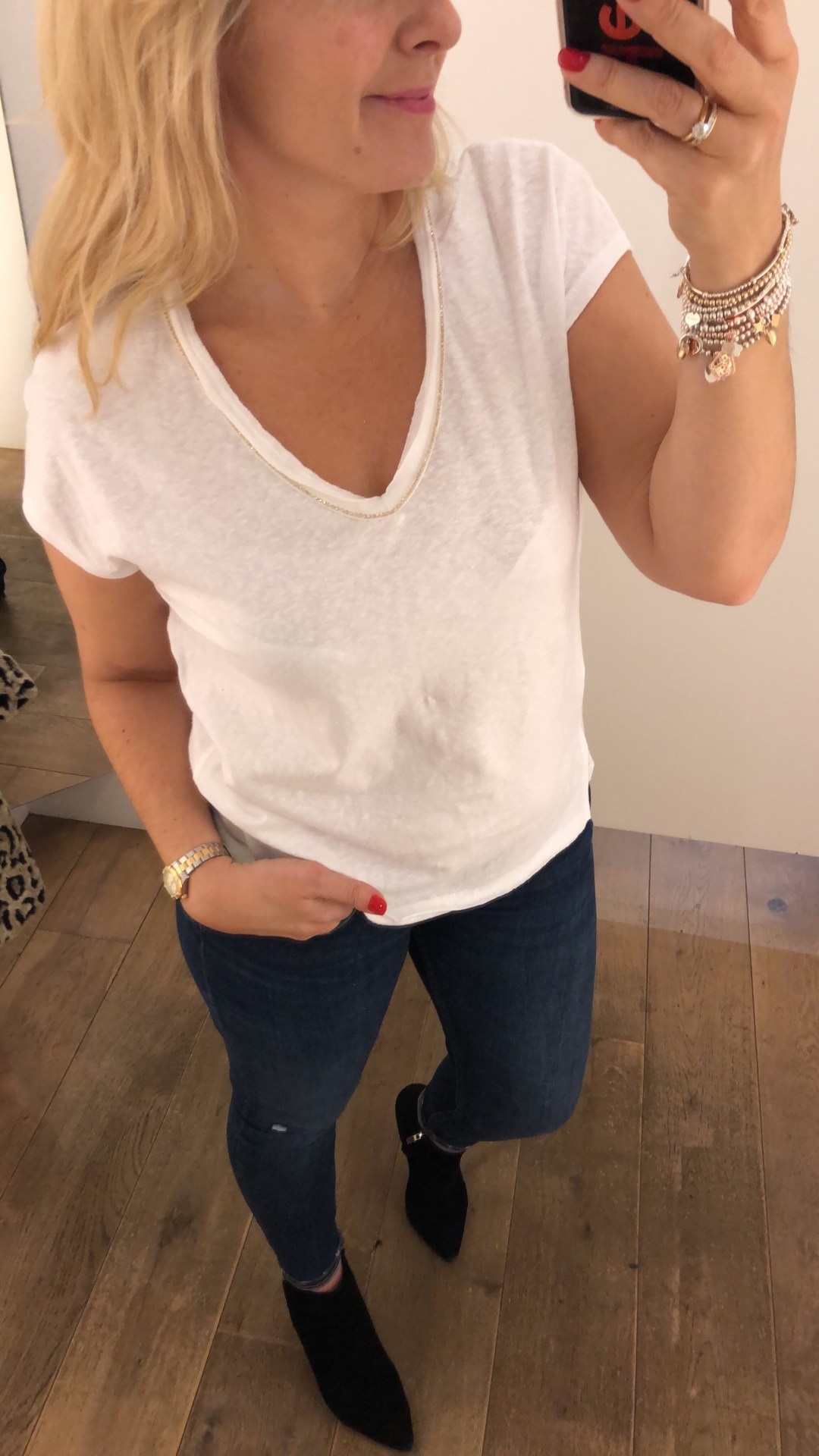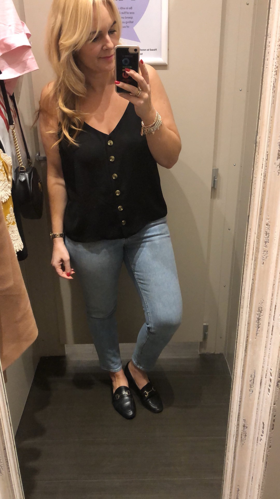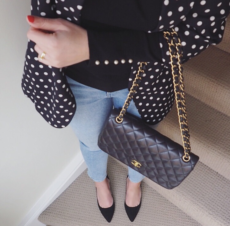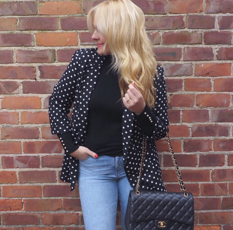 Black blazer, silk cami, jeans and patent stilettos (night out)