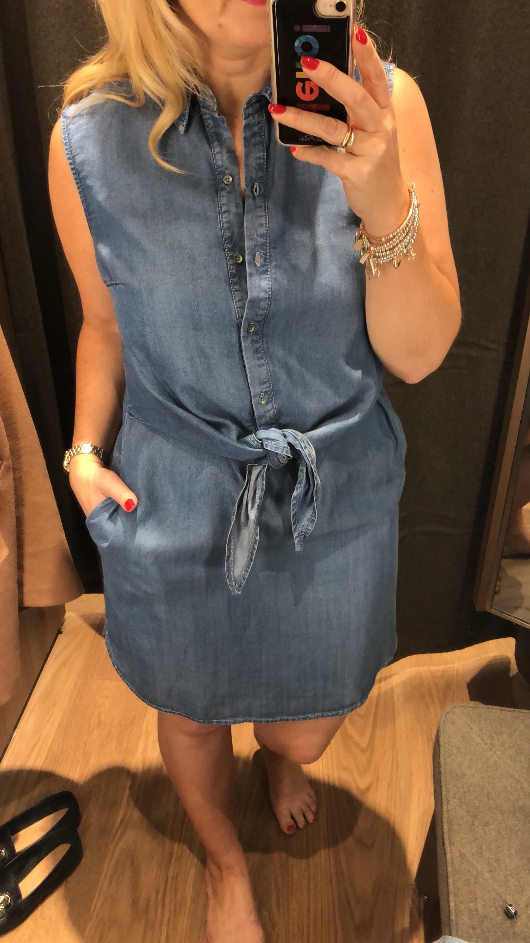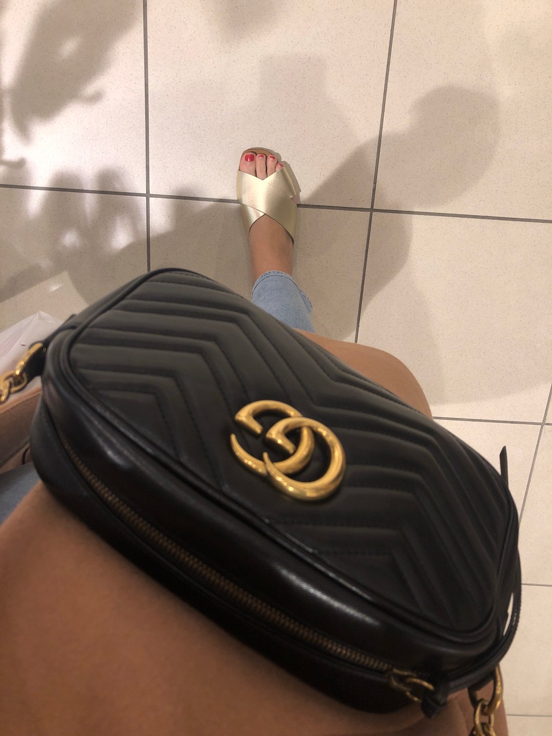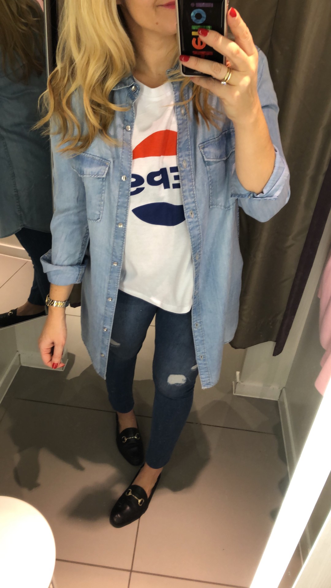 Trench, Satin blouse, pale blue jeans and white kitten heels (brunch)