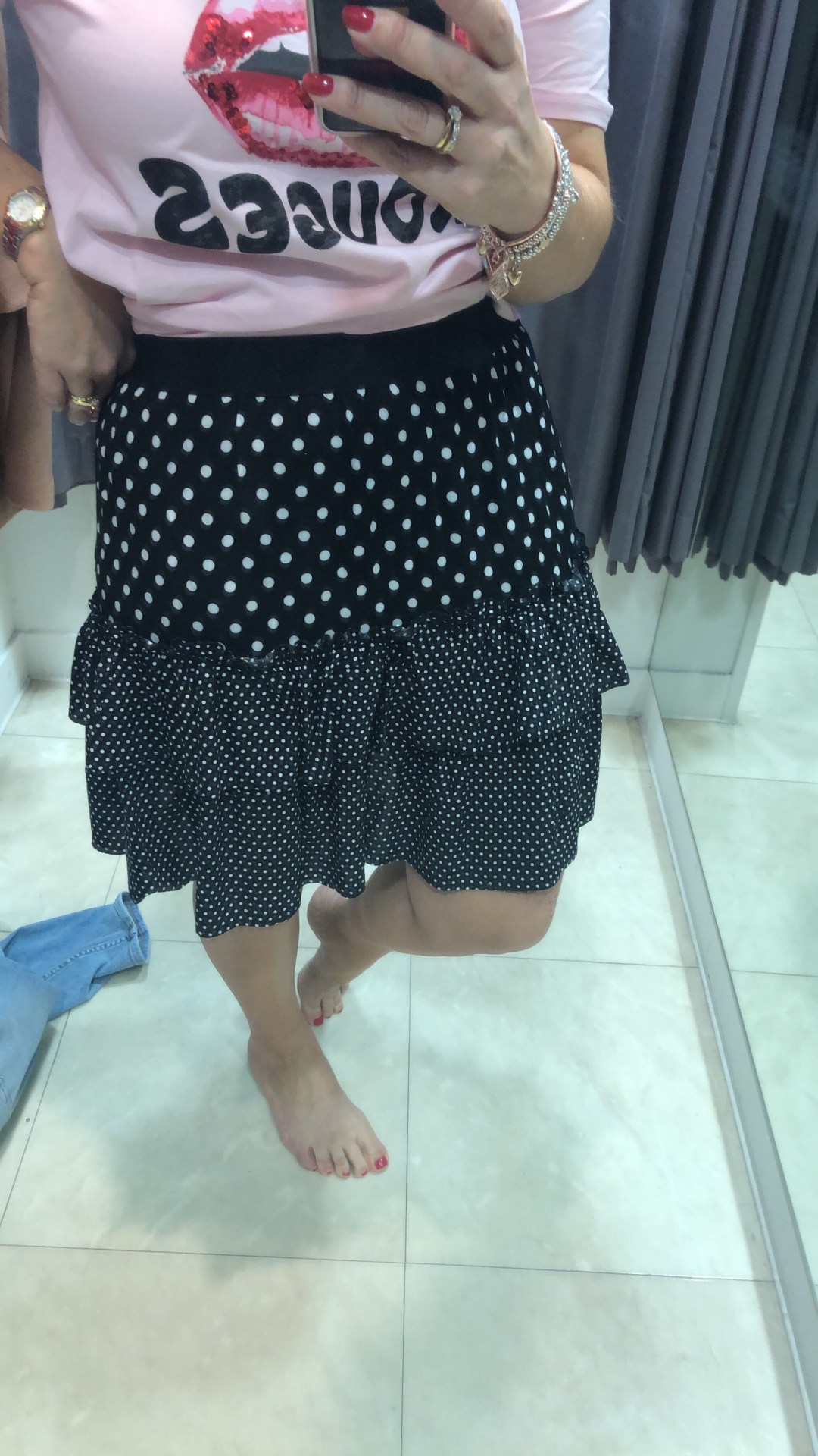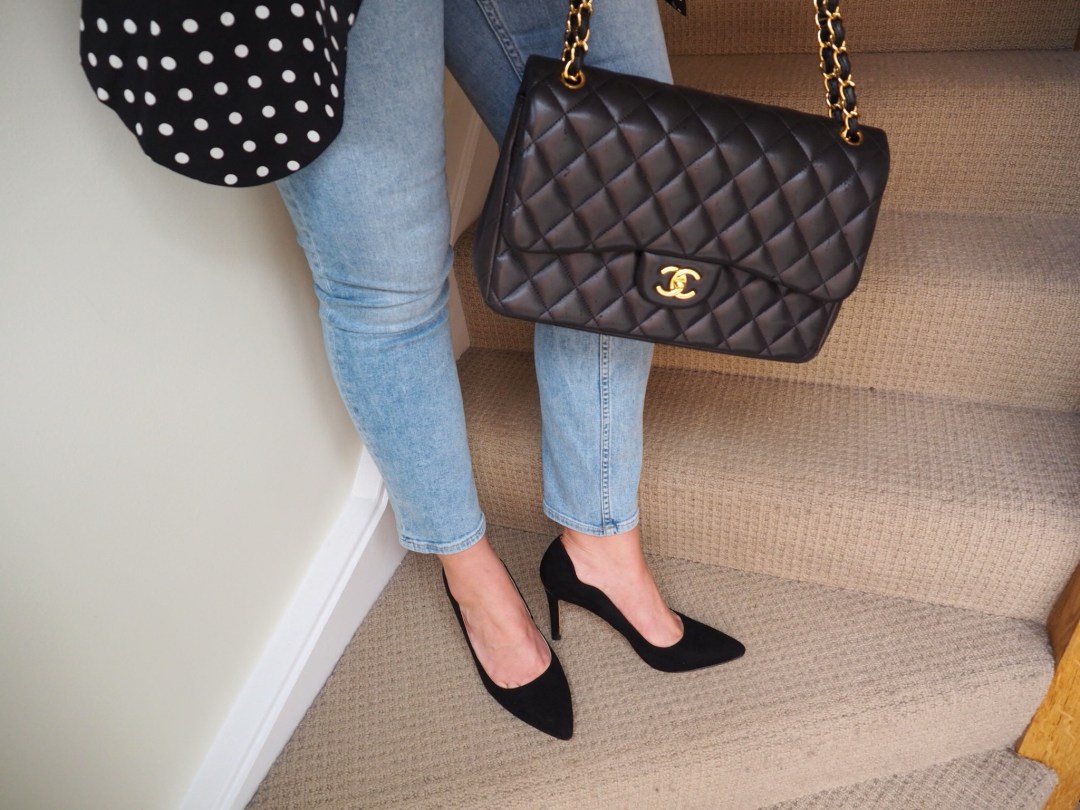 Black lace dress and spotty kitten heels (occasion)