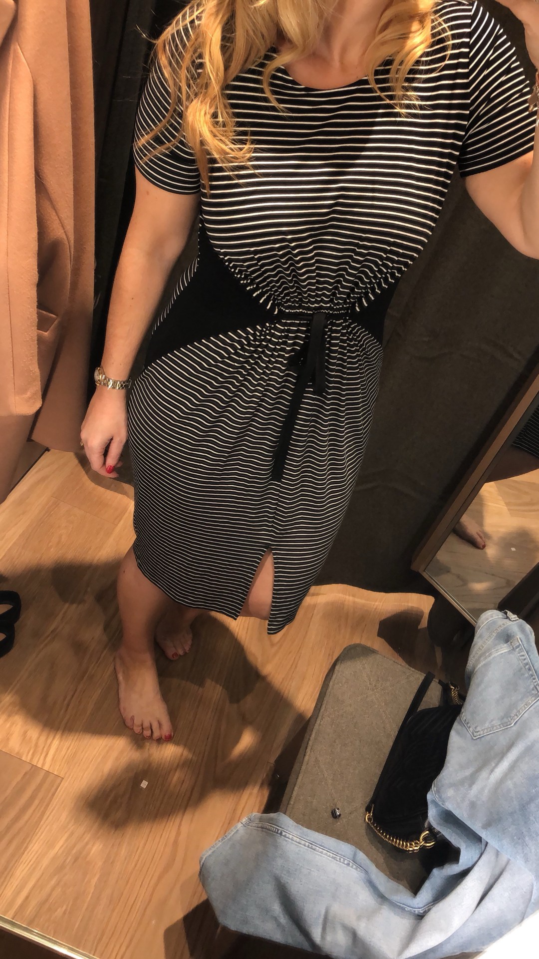 Denim midi, stripe top and trainers (everyday)